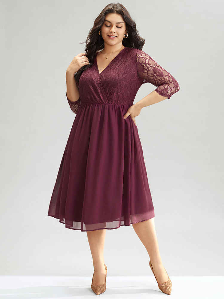 Chiffon Crochet Lace Mesh Surplice Neck Dress