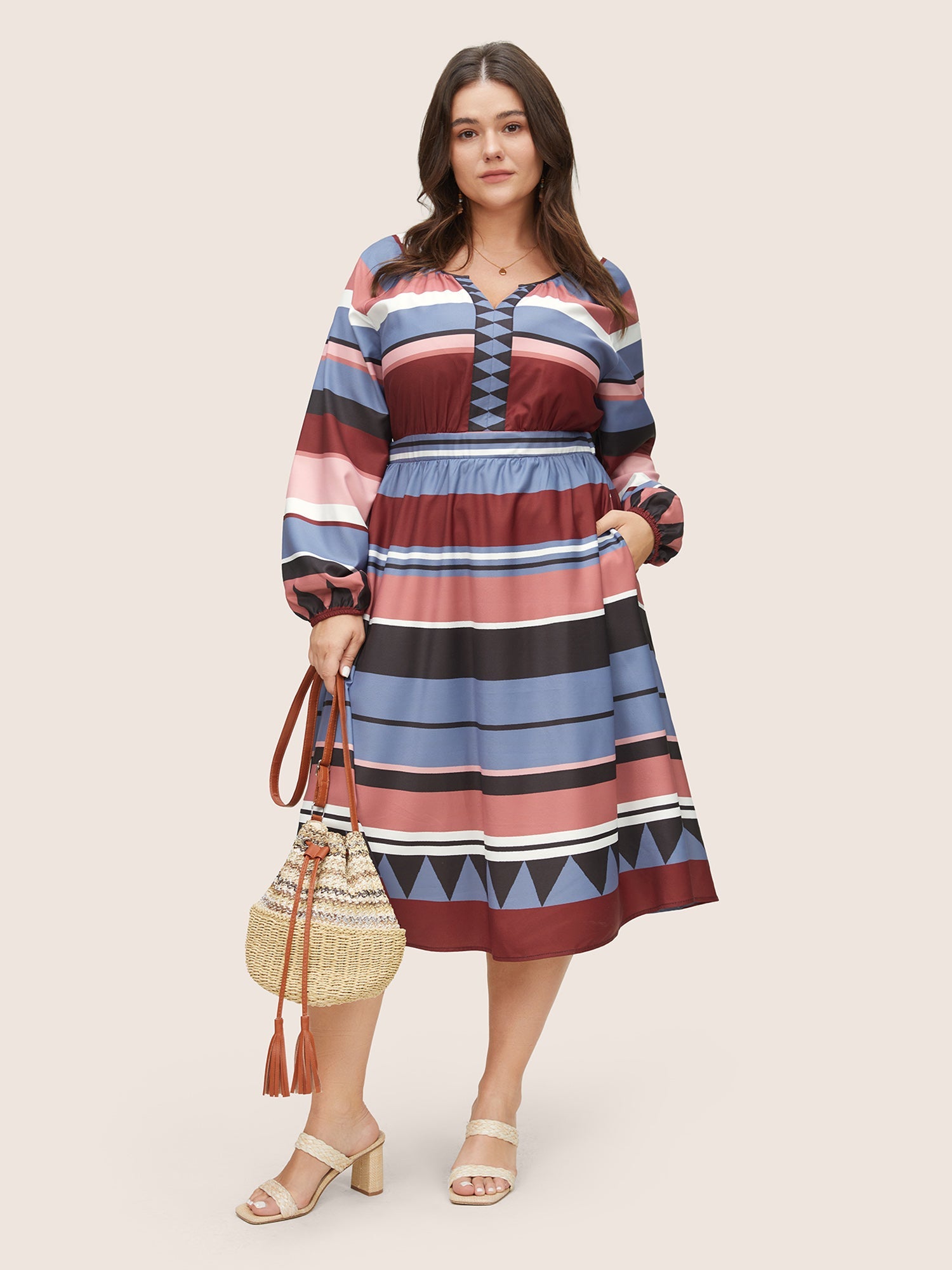 Colorblock Geometric Notched Pocket Elastic Cuffs Dress