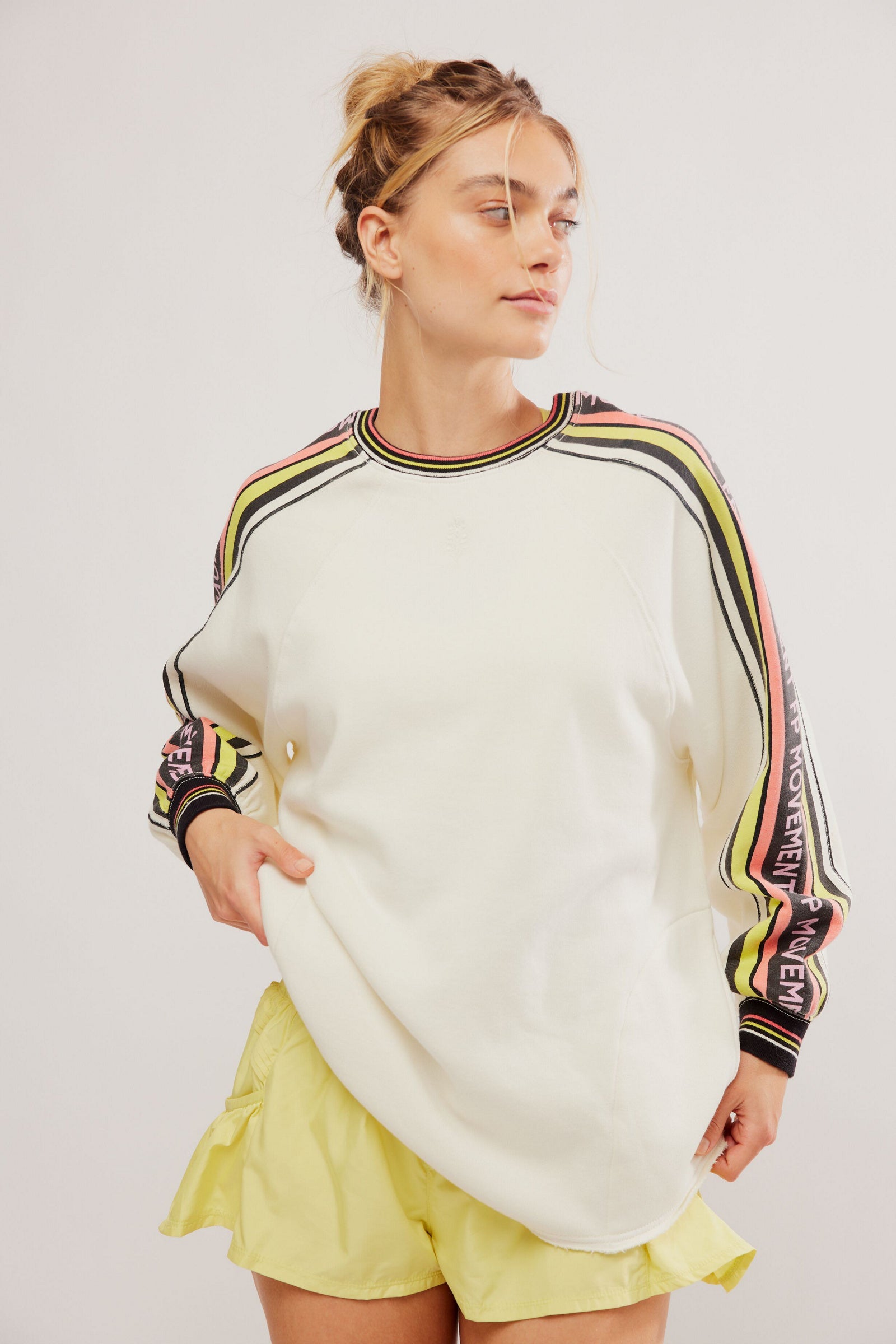 Oversized Free People movement Logo and stripes along arms and pockets on the front.