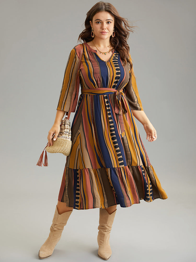 Cotton Striped Colorblock Belted Notched Dress