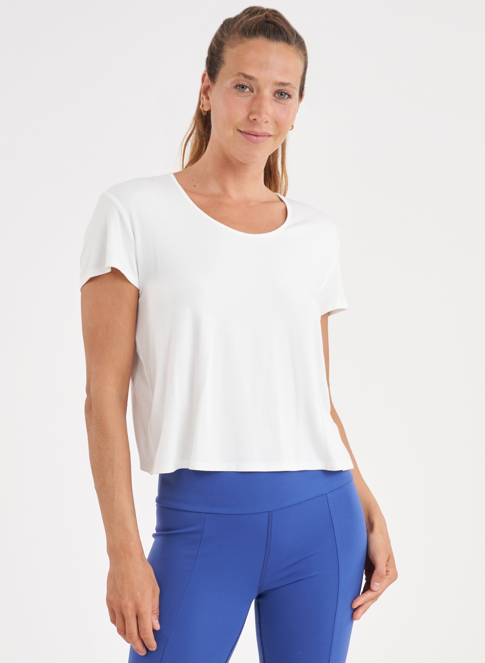 This white Cross Back Tee is lightweight and breathable, allowing you to stay comfortable during any activity. The cropped design adds a stylish touch while keeping you cool. Perfect for any workout or casual wear.
