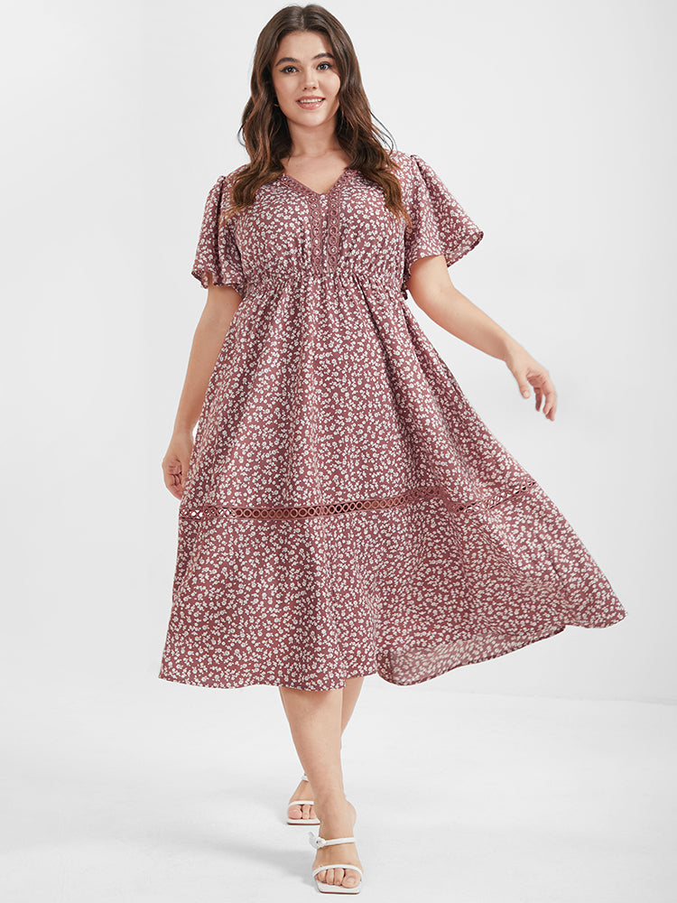 Ditsy Floral Crochet Lace Ruffled Midi Dress
