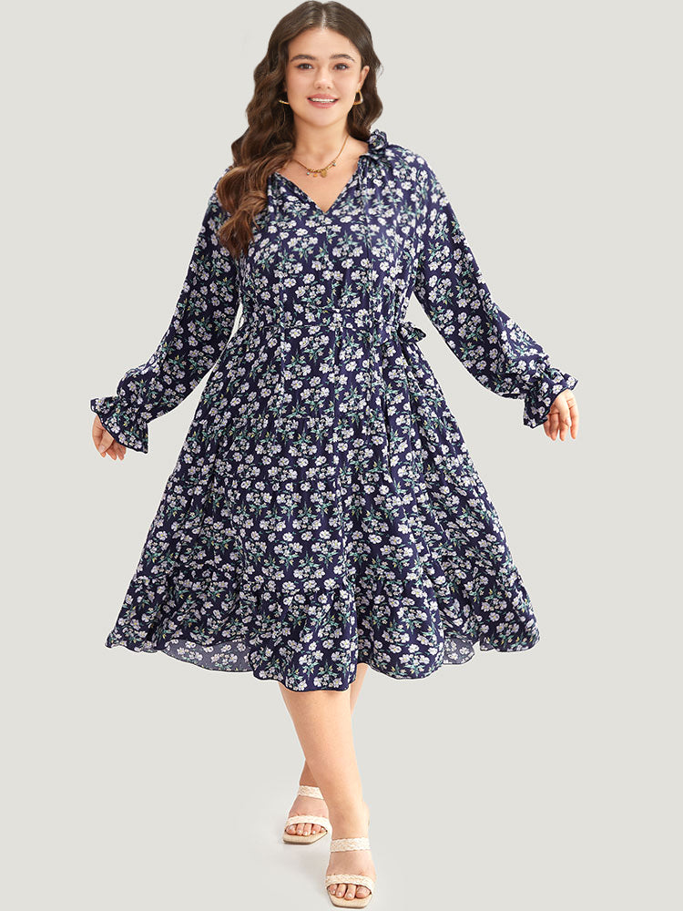 Ditsy Floral Pocket Tie Neck Frill Trim Dress