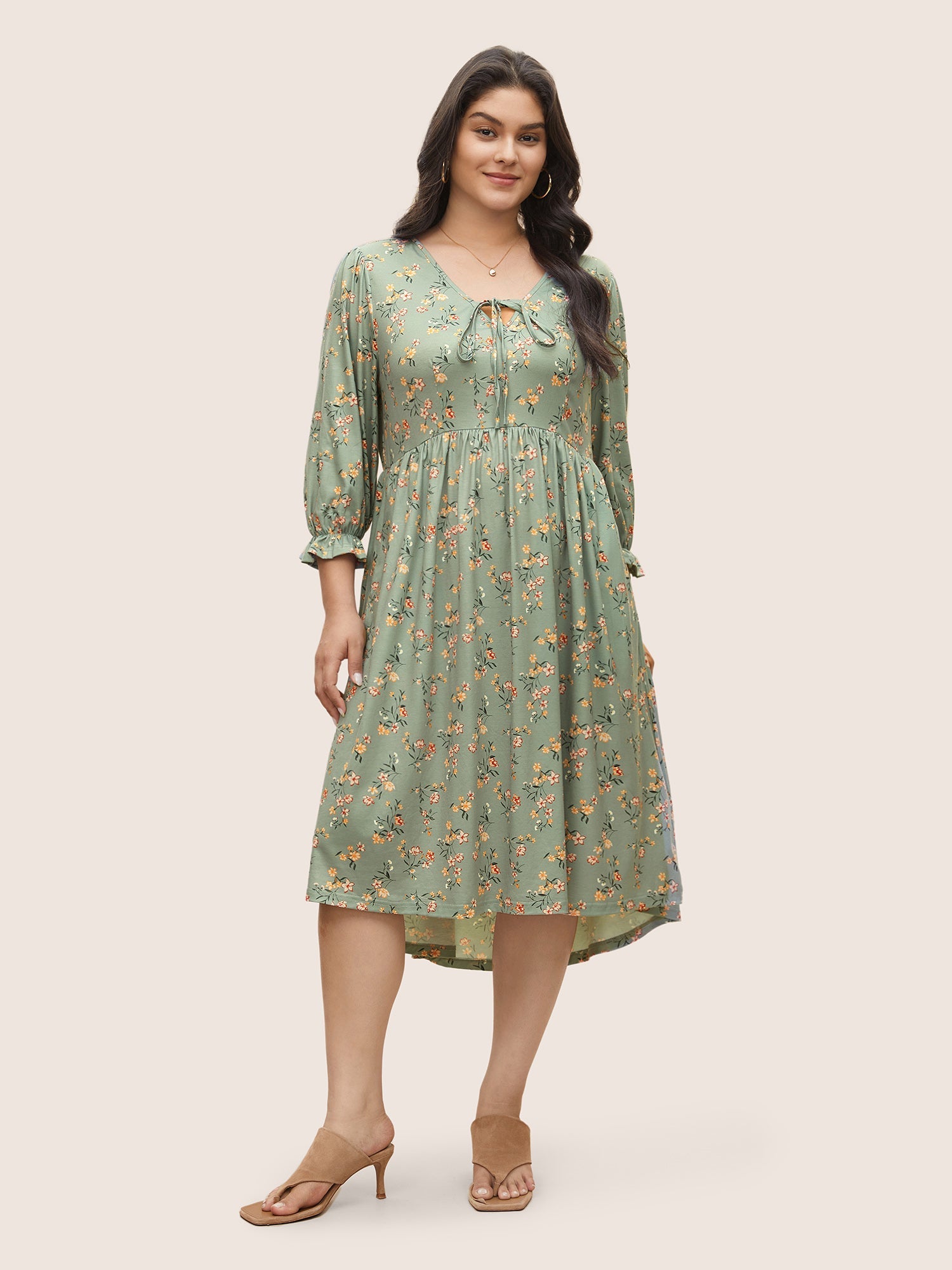 Ditsy Floral Tie Neck Flutter Sleeve Gathered Dress