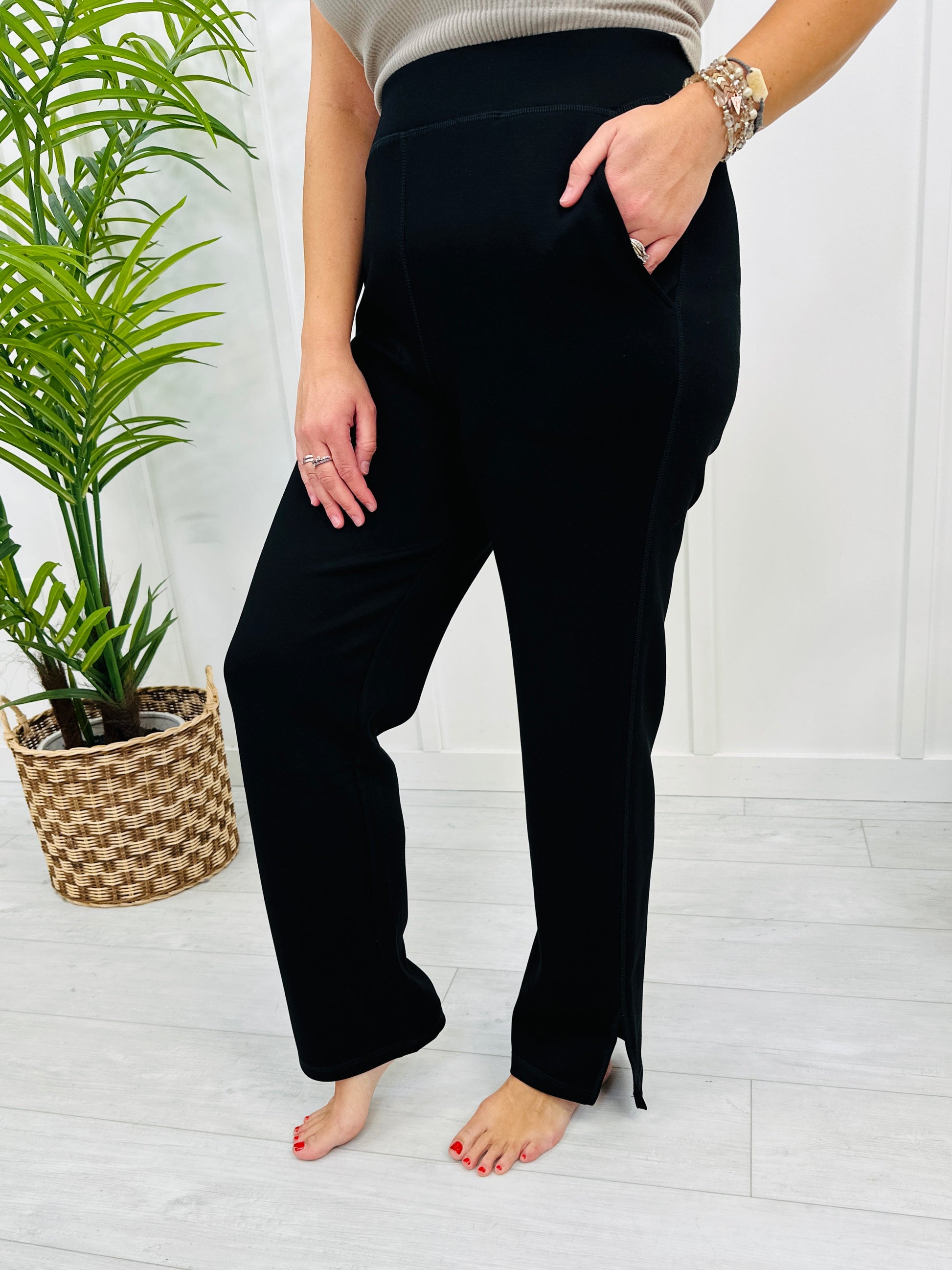 These ultra soft a cozy black bottoms feature small slits and pockets, making them both stylish and functional. Step into effortless style and comfort with the straight leg fit.