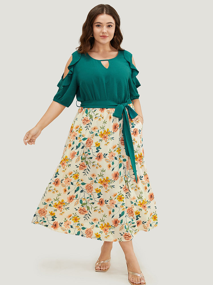 Floral Patchwork Keyhole Belted Pocket Ruffle Trim Cold Shoulder Dress