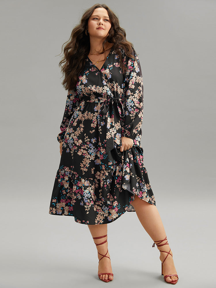 Floral Print Overlap Collar Elastic Cuffs Dress