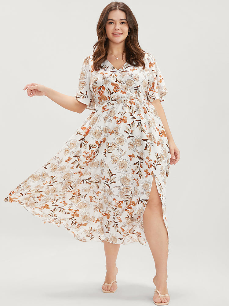 Floral Surplice Neck Pocket Flutter Split Hem Dress