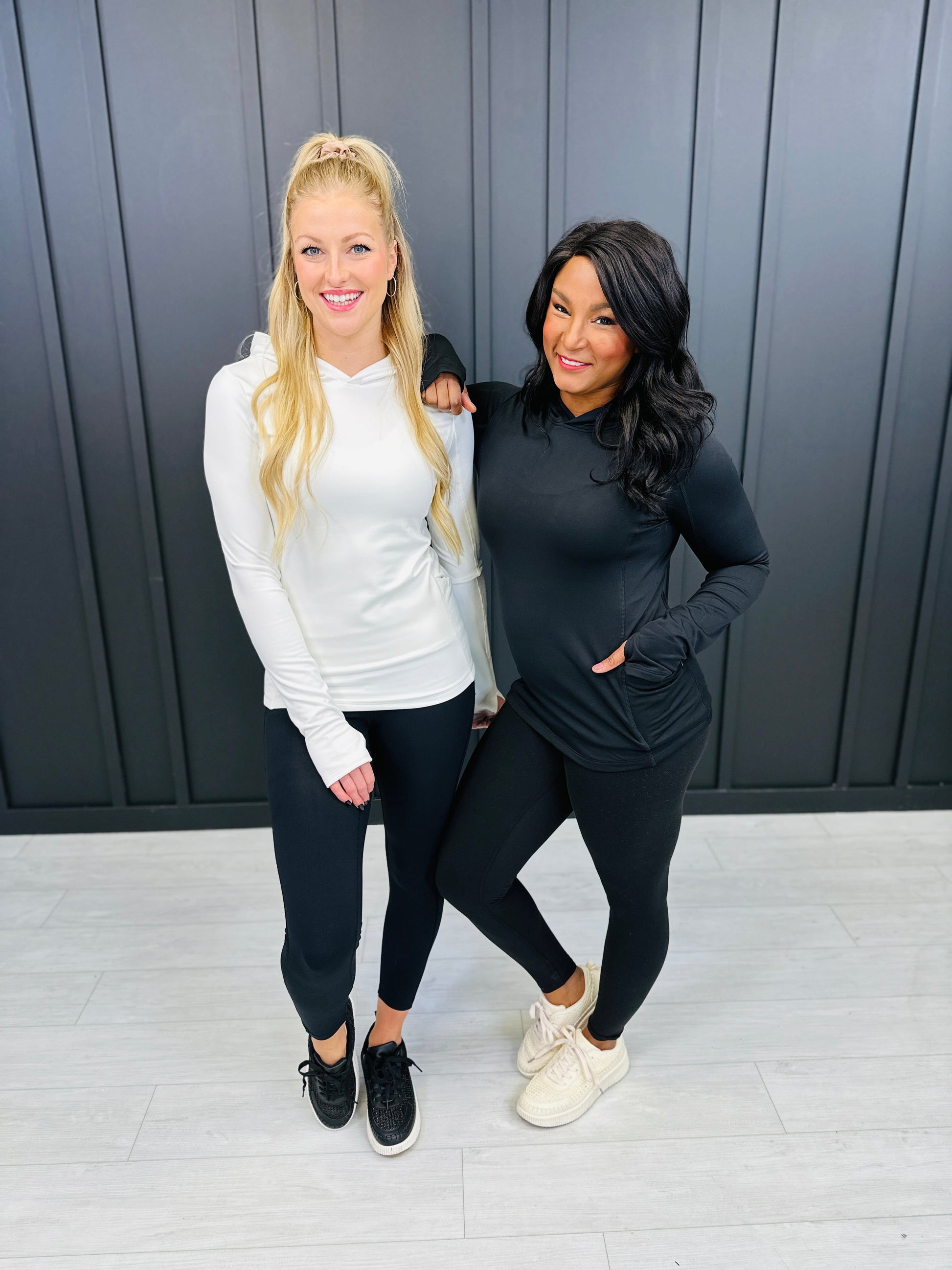 Available in ivory or black, this ultra-comfy top gives you the options you need to suit your style. Its neutral color and flattering seam details make it a versatile and comfortable choice for everyday wear, while the thumb holes and zippered side pockets add convenience and a touch of casual flair.