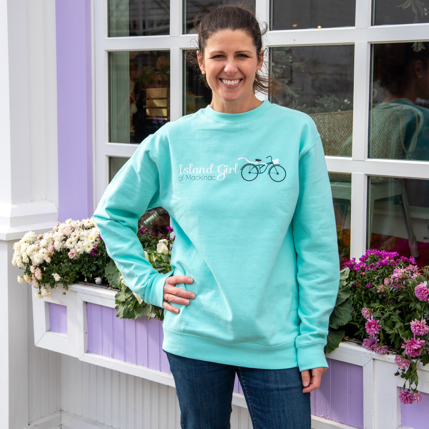 Bring home this cute Island Girl of Mackinac Mint Crewneck for chilly summer nights spent outside.