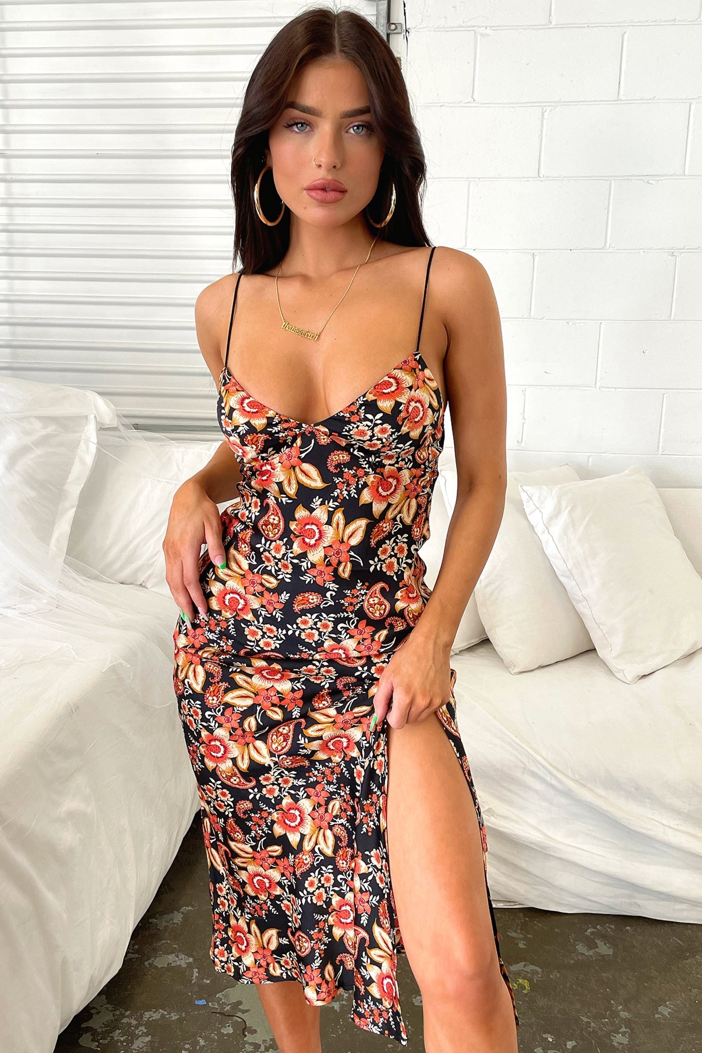Looking sweet and sexy in the gorgeous Jennifer Dress in Black Floral. This babe is made from a soft, satin like fabrication, in Midi length. She features thin, spaghetti straps, triangle cupped bust, elasticated backing for the perfect fit and sexy thigh high split. Pair her with your fave nude heels and a clutch for your next dinner date.