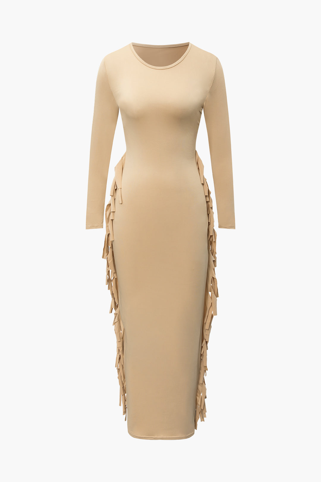 Round Neck Solid Color Fringe Trim Maxi Dress