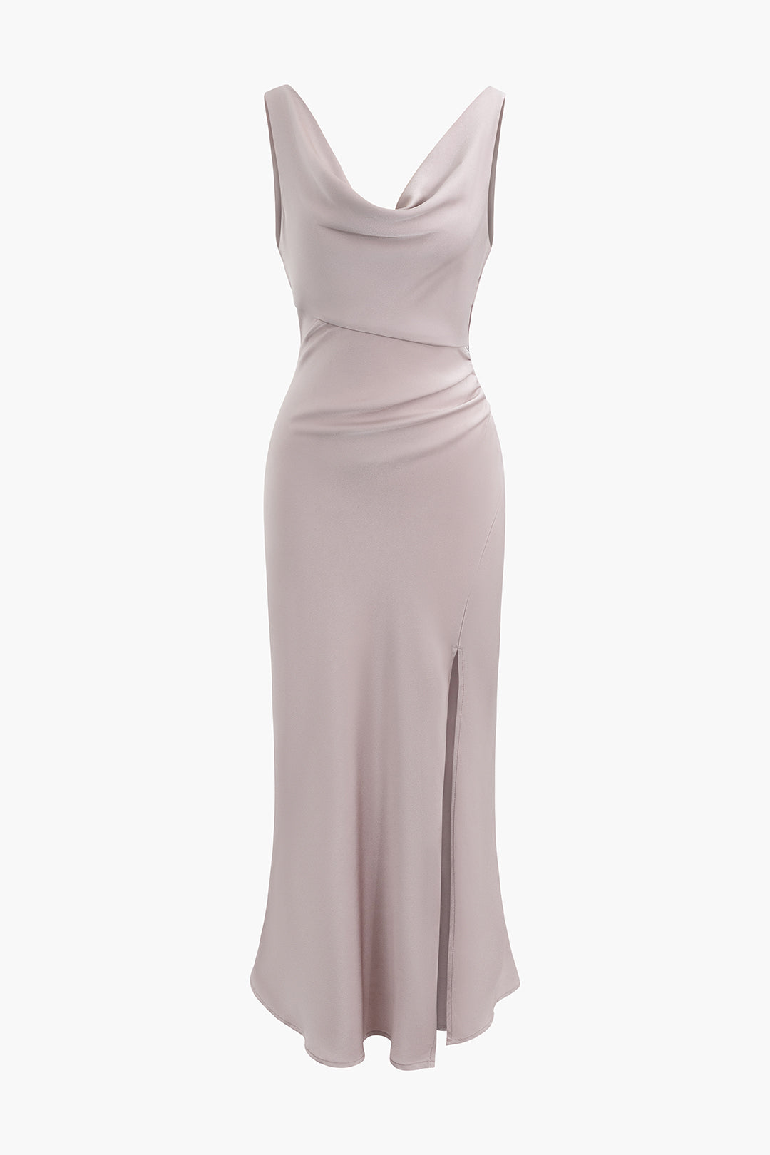 Ruched Cowl Neck Sleeveless Slit Maxi Dress