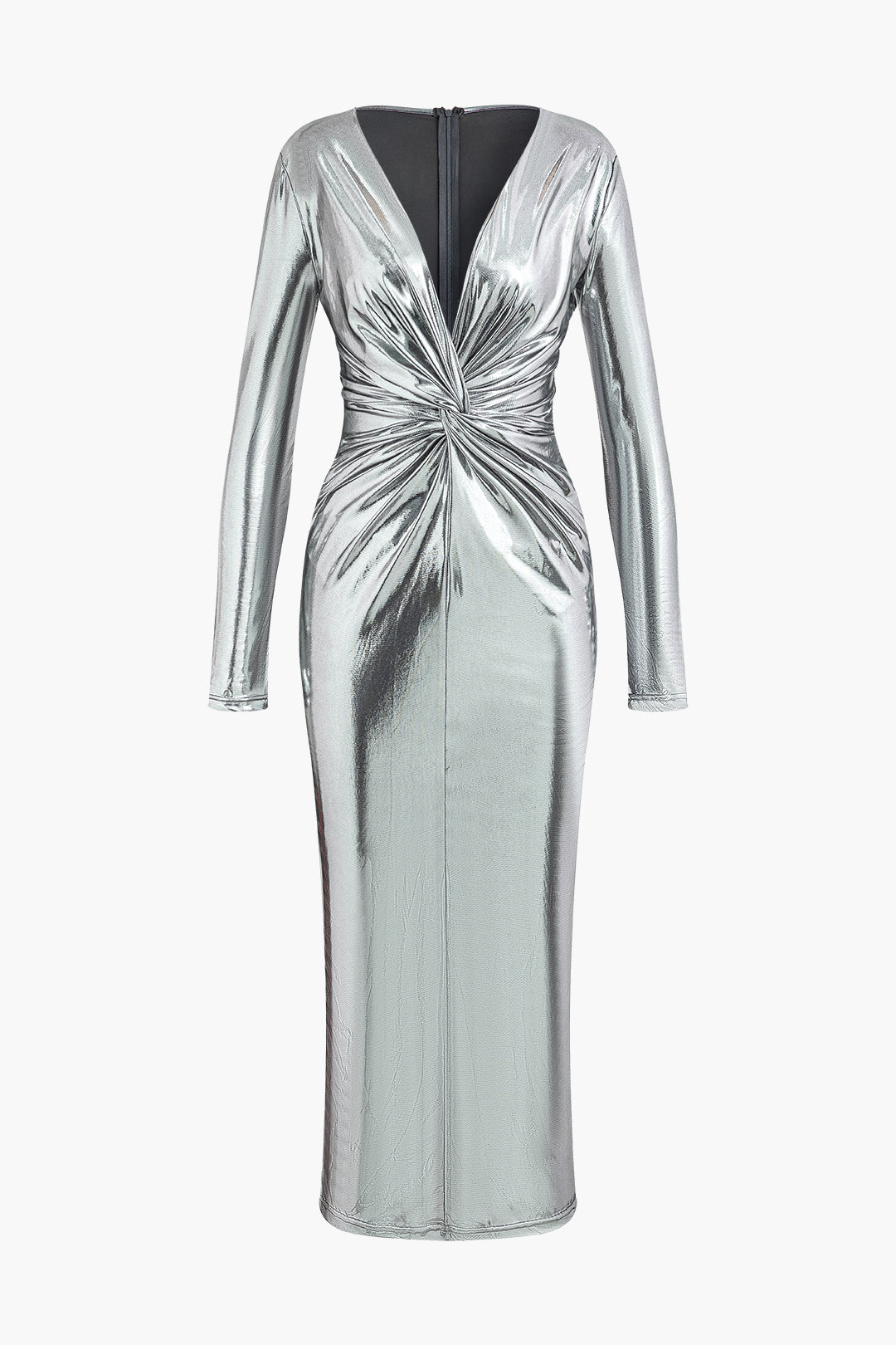 Metallic Twist Ruched V-neck Zipper Long Sleeve Midi Dress