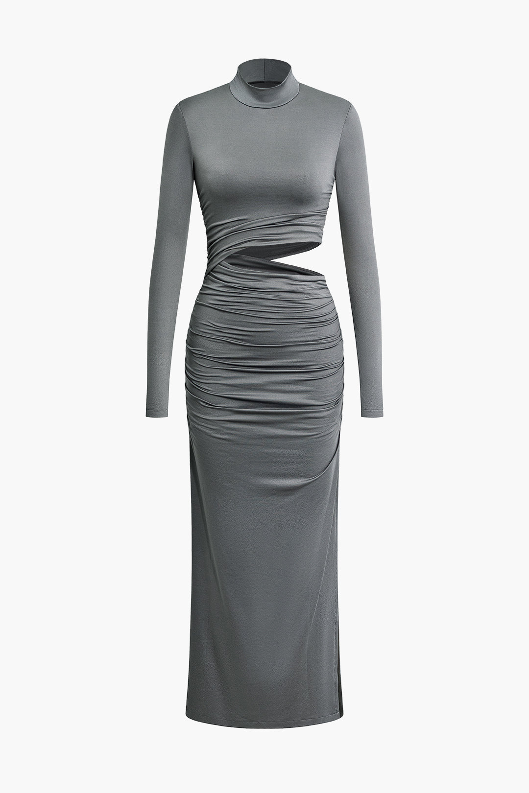 Mock Neck Cut Out Ruched Long Sleeve Midi Dress