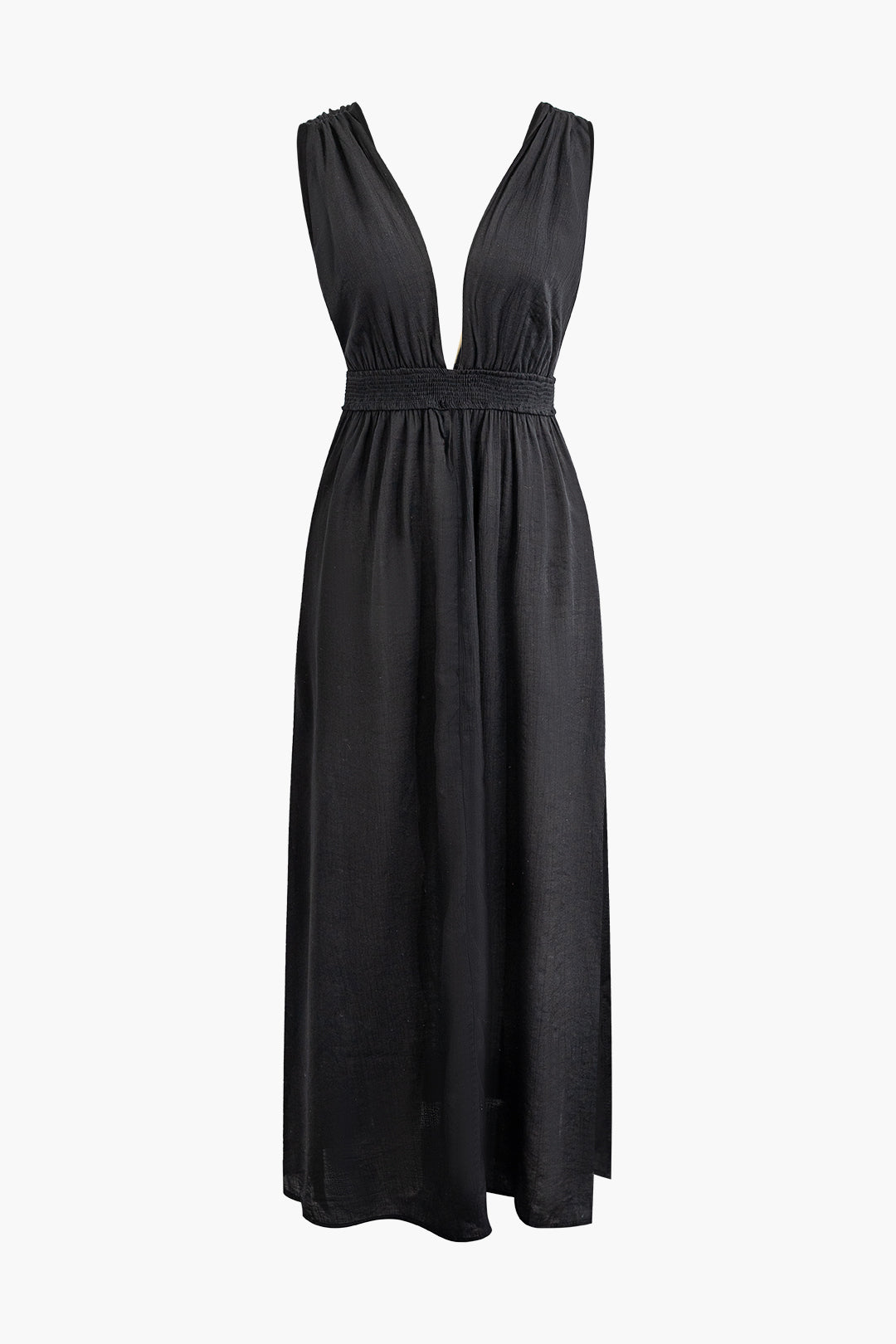 Deep V-neck Ruched Sleeveless Maxi Dress