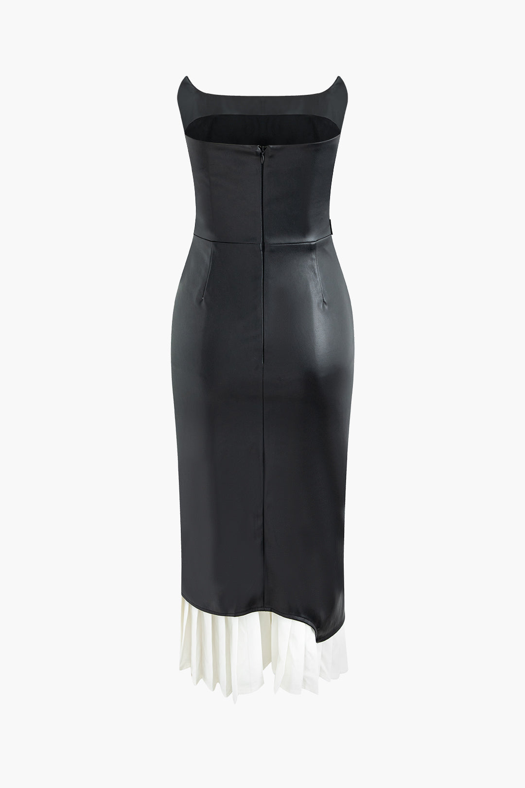 Contrast Strapless Faux Leather Pleated Midi Dress