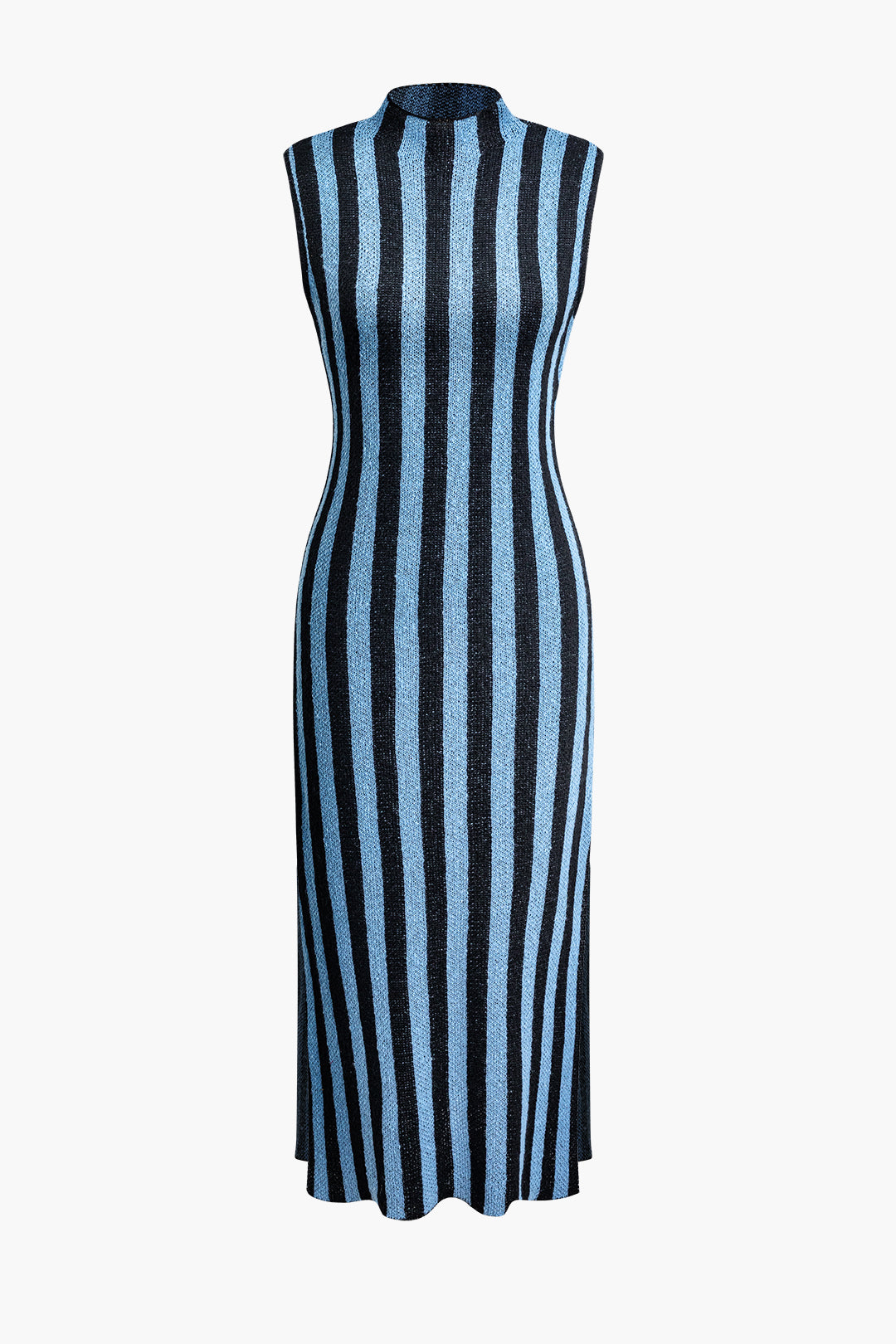 Vertical Stripe Mock Neck Knit Slit Sleeveless Midi Dress