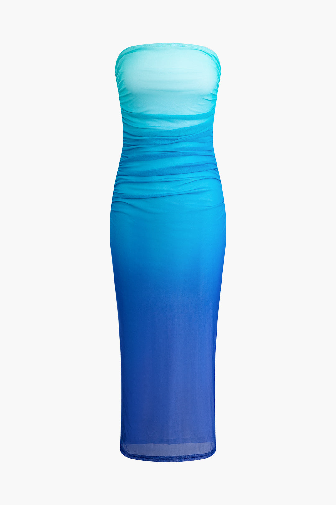 Ombre Mesh Slit Ruched Strapless Midi Dress