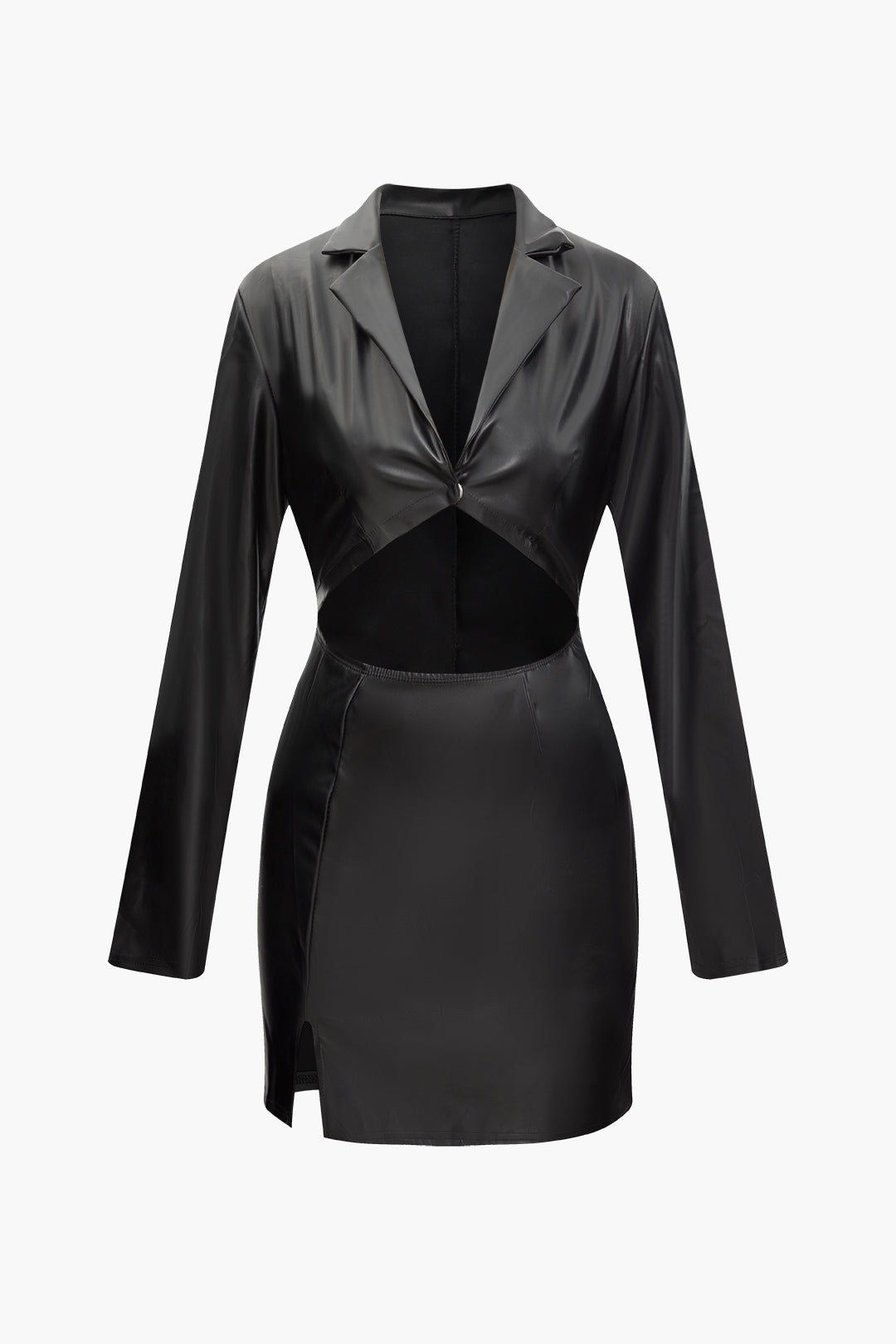 Faux Leather V-neck Notched Lapel Cut Out Slit Mini Dress