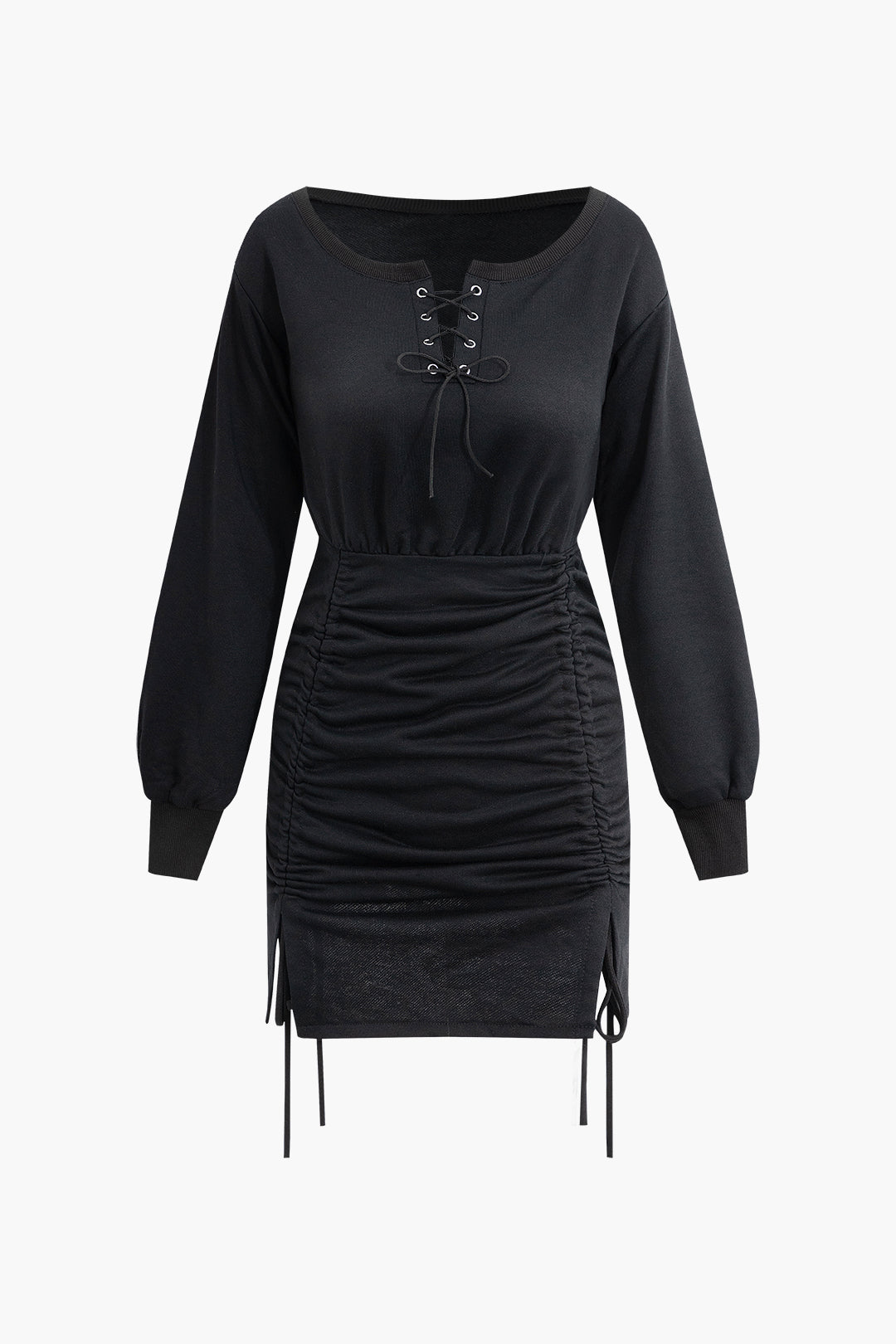 Eyelet Tie Ruched Drawstring Slit Mini Dress
