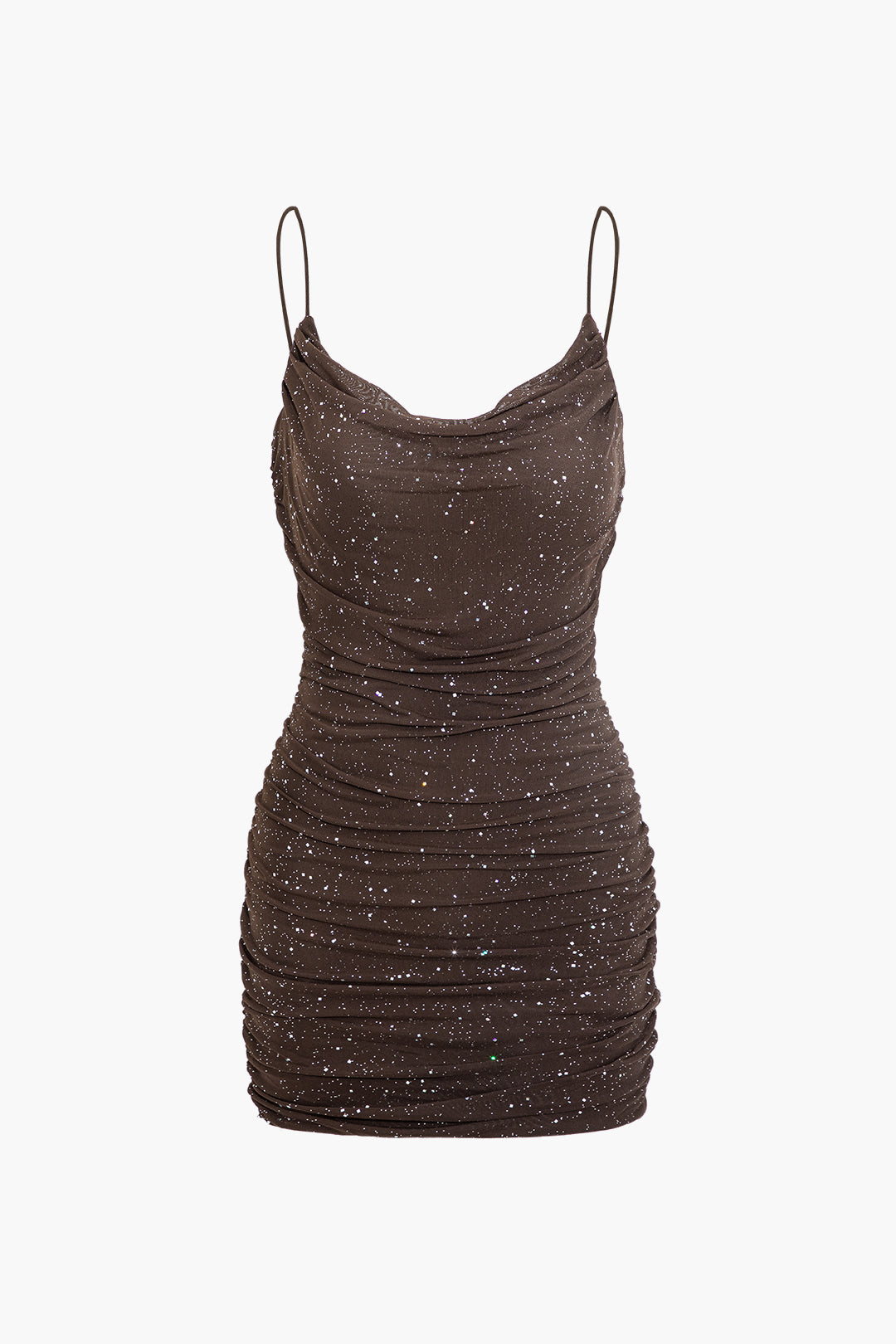 Sequin Cowl Neck Ruched Mesh Slip Mini Dress