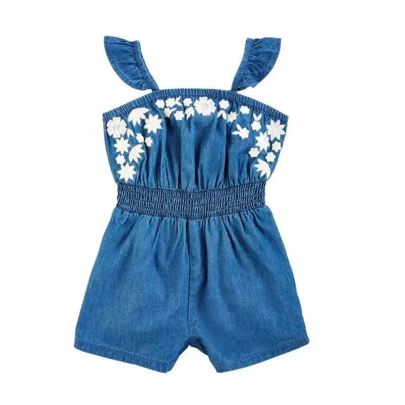 Take it easy this Summer with our Toddler Embroidered Denim Romper. The denim romper features embroidered chest with white floral details. The denim romper features flutter sleeves. The romper also features a smocked waist. This romper looks great with a white denim jacket.