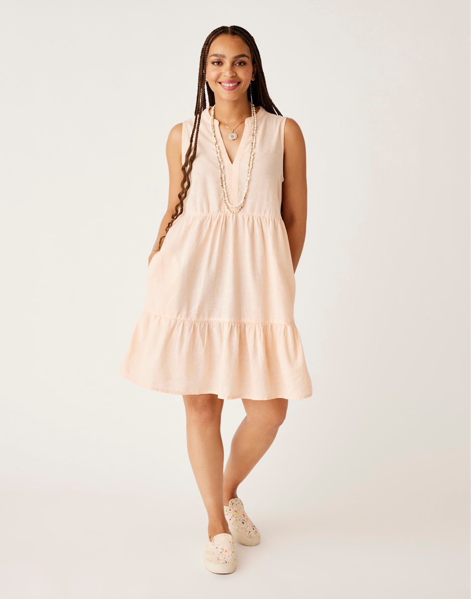 Every day feels like a vacation in this loose, light and flowy linen dress. Her captivating tiered silhouette is ready to spin, while simple side pockets await sea shells and sea glass.