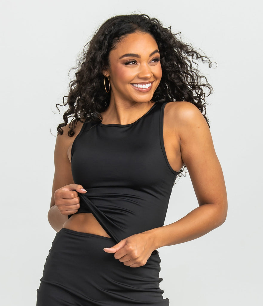 - fitted high-neck tank with slight boatneck styling