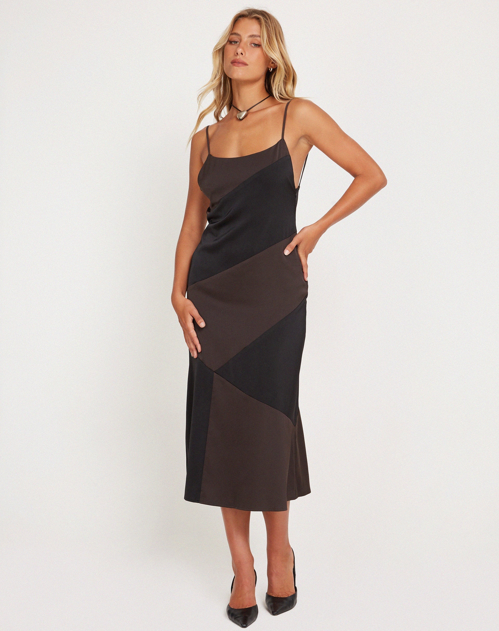 An essential satin midi dress your wardrobe needs. The Perlita Dress features an asymmetrical design, thin straps in a two tone black colour.