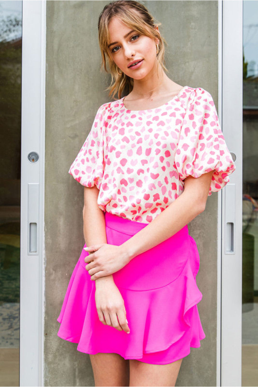 Heart pattern print top with a U-neck, short puffed sleeves.