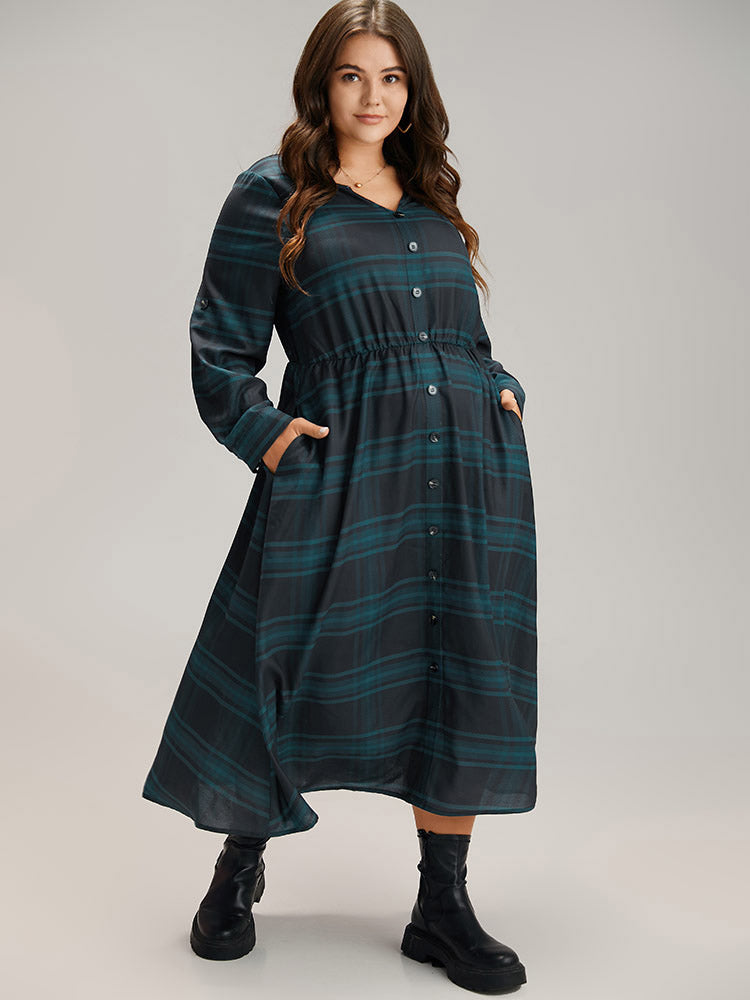 Plaid Button Detail Notched Tab Sleeve Dress
