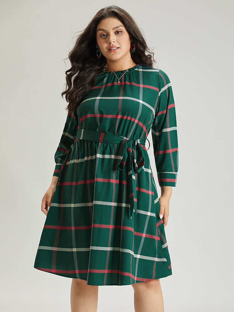 Plaid Stand Collar Gathered Belted Dress