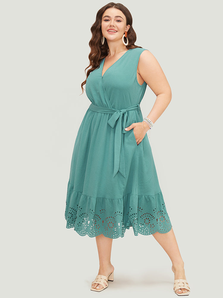 Plain Pocket Wrap Belted Laser Cut Flutter Tank Dress