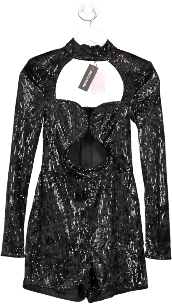 PrettyLittleThing Black Sequin Velvet Wire Cut Out Playsuit UK 6