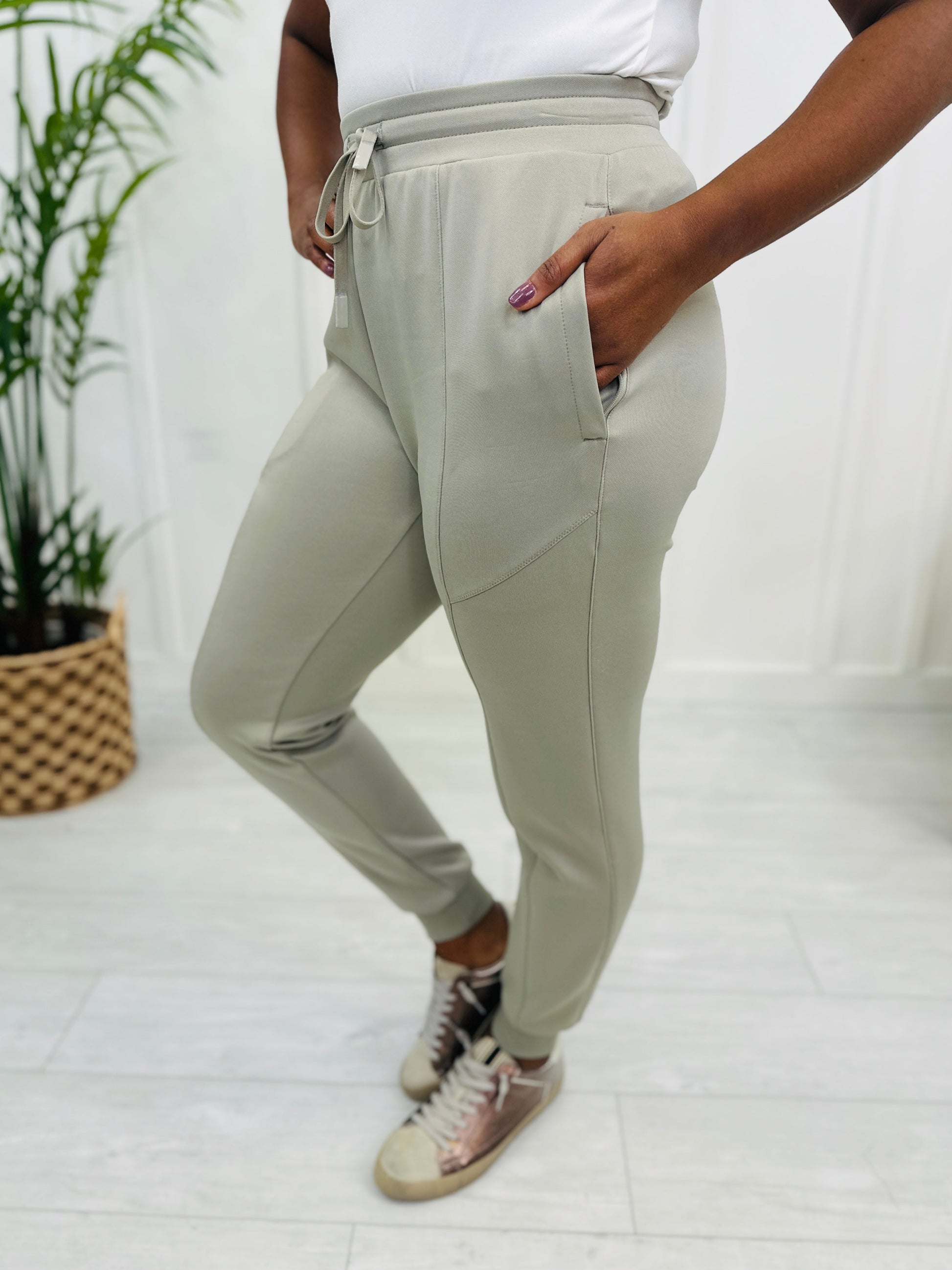These ultra-soft and comfortable joggers feature large zippered pockets, a drawstring waist, and flattering seam details that take your look to the next level. In a neutral and light ash grey, make an effortless statement wherever you go.