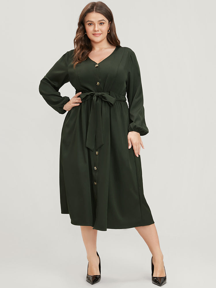 Solid Button Through Pocket Lantern Sleeve Tie Up Dress