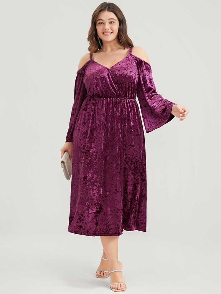 Solid Cold Shoulder Pocket Bell Sleeve Velvet Dress