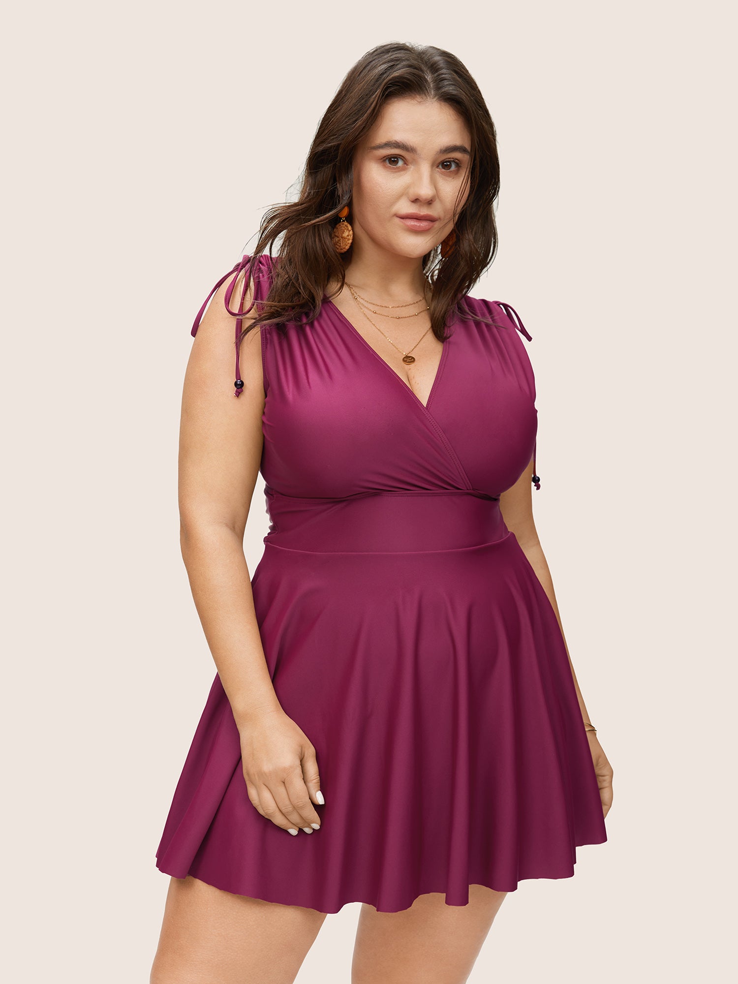Solid Drawstring Adjustable Straps Back Swim Dress