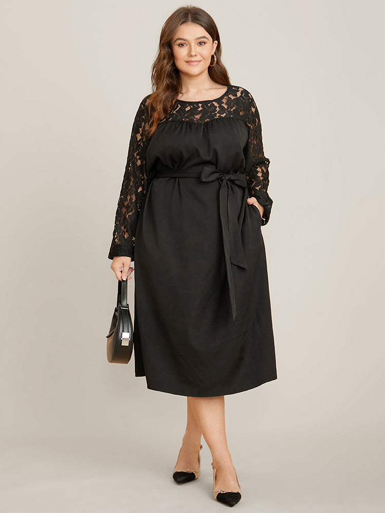 Solid Round Neck Belted Contrast Lace Midi Dress