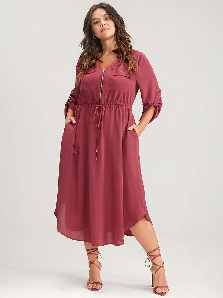 Solid Zipper Cuffed Sleeve Pocket Tie Up Asymmetrical Hem Dress