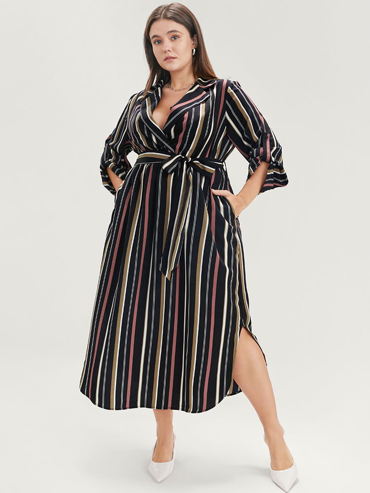Striped Lapel Collar Cuffed Sleeve Pocket Belted Arc Hem Dress