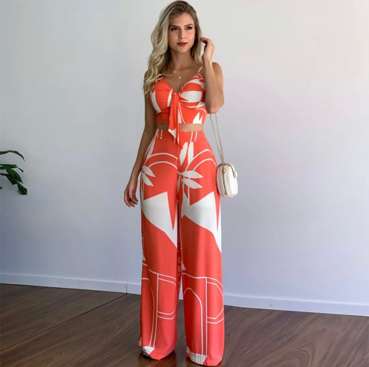 Two Piece linen set V-neck printed tank top crop top with high waist loose fitting pants to match. Color Orange. Not stretchy.