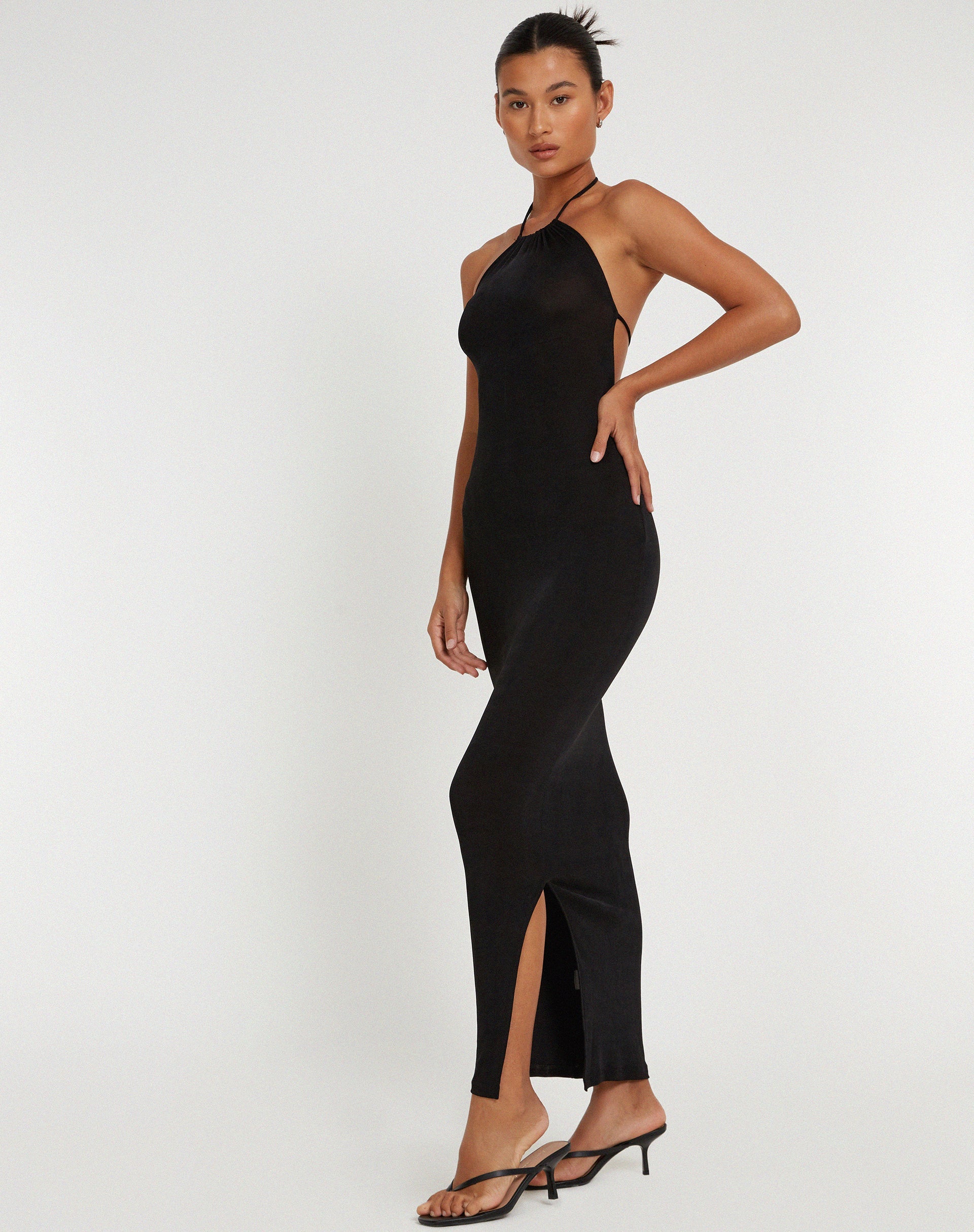 Turn heads with the Virnilia dress, featuring halterneck straps and a maxi length hem, in black.