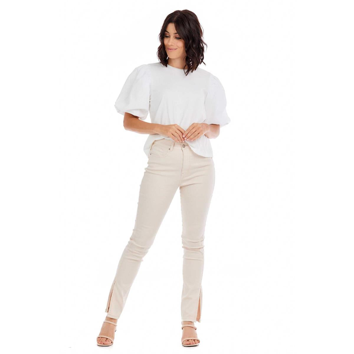 Cotton jersey top features cotton poplin balloon short sleeves. Measures approximately 23" from shoulder to hem on size small.
